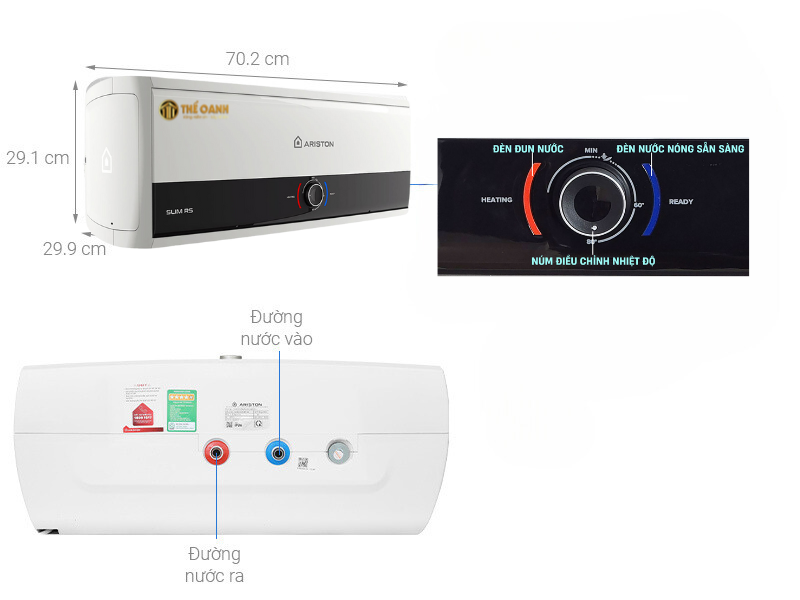 - Bình nóng lạnh Ariston Slim3 có thiết kế hình chữ nhật ngang, kiểu dáng sang trọng, gọn gàng phù hợp với không gian phòng tắm của gia đình.