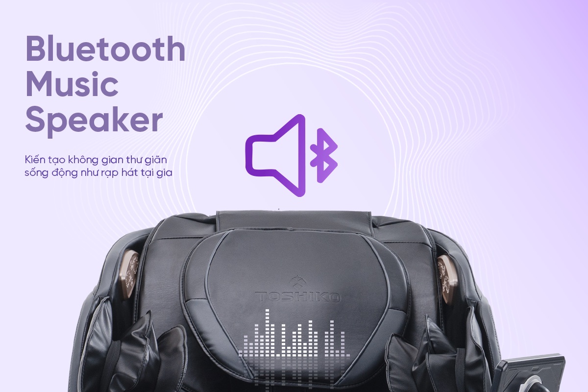 Ghế massage T90 được trang bị loa nghe nhạc bluetooth chất lượng cao ở ngay đầu ghế, tạo nên không gian âm thanh bao quanh toàn bộ vùng nằm massage. Âm thanh trong trẻo, dải tần rộng, mang đến cảm giác như đang nằm giữa một rạp hát cá nhân tại gia. Chỉ cần kết nối nhanh chóng với smartphone hoặc tablet qua Bluetooth, người dùng có thể bật/phát nhạc dễ dàng.
