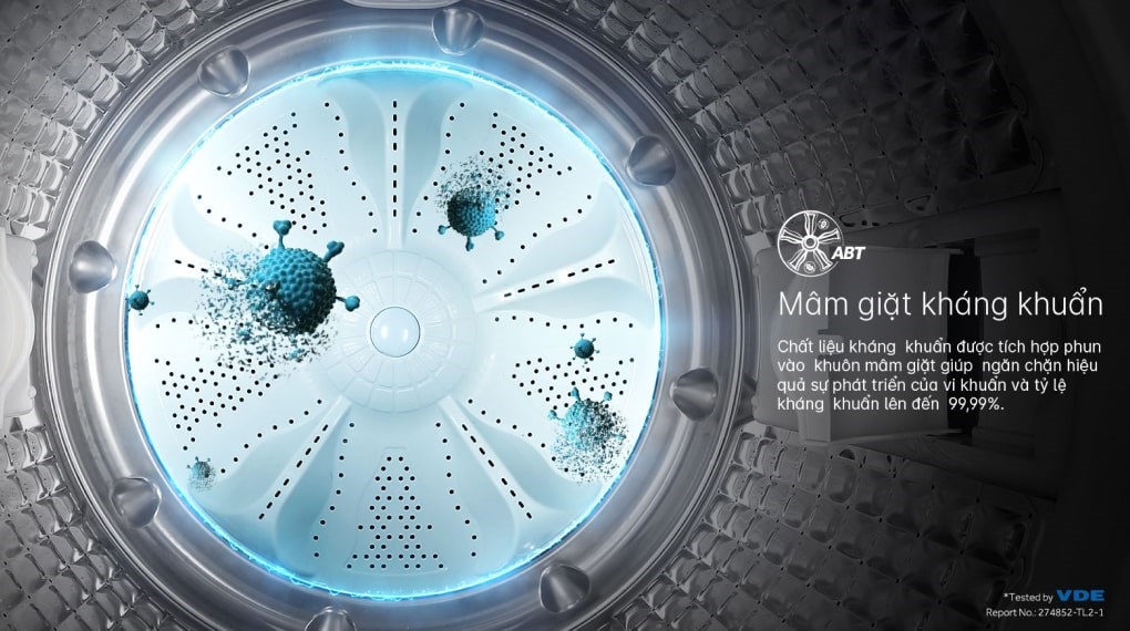 Mâm giặt ABT được phun một lớp chất liệu kháng khuẩn giúp ức chế 99.99% vi khuẩn sinh sôi, gây ra mùi hôi khó chịu đặc biệt là trong môi trường ẩm ướt của máy giặt, giữ quần áo của bạn luôn sạch sẽ và thơm tho.
