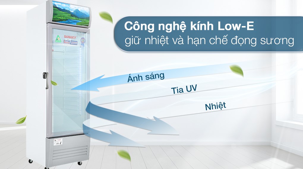 Tủ mát Sanaky 200 lít VH258KL được trang bị công nghệ kính Low-E có khả năng phản xạ nhiệt, ngăn chặn tia cực tím làm ảnh hưởng đến thực phẩm bảo quản trong tủ. Ngoài ra, cửa tủ còn có khả năng hạn chế đọng sương trên cánh tủ, giúp dễ dàng quan sát thực phẩm bên trong.